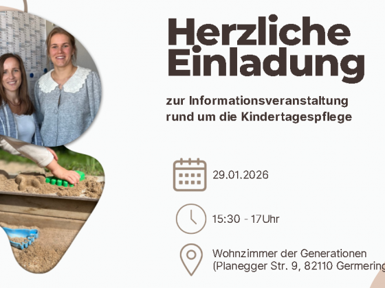 Herzliche Einladung zur Informationsveranstaltung rund um die Kindertagespflege!Am 29.01.2026 von 15:30–17:00 Uhr laden wir Sie herzlich ein, sich über die Kindertagespflege im Landkreis Fürstenfeldbruck zu informieren.In angenehmer Atmosphäre erhalten Sie Einblicke in diese familiennahe Betreuungsform und haben...